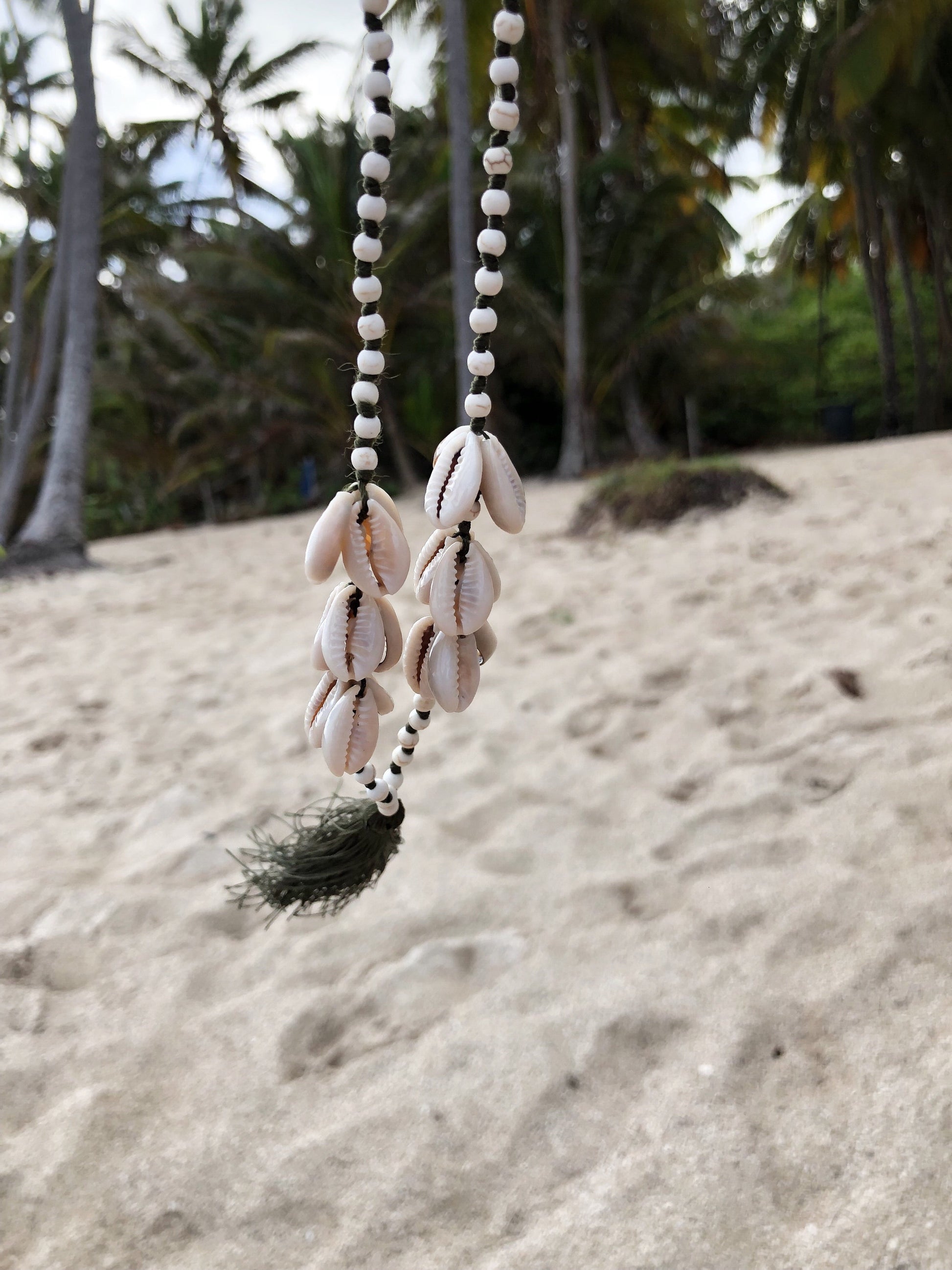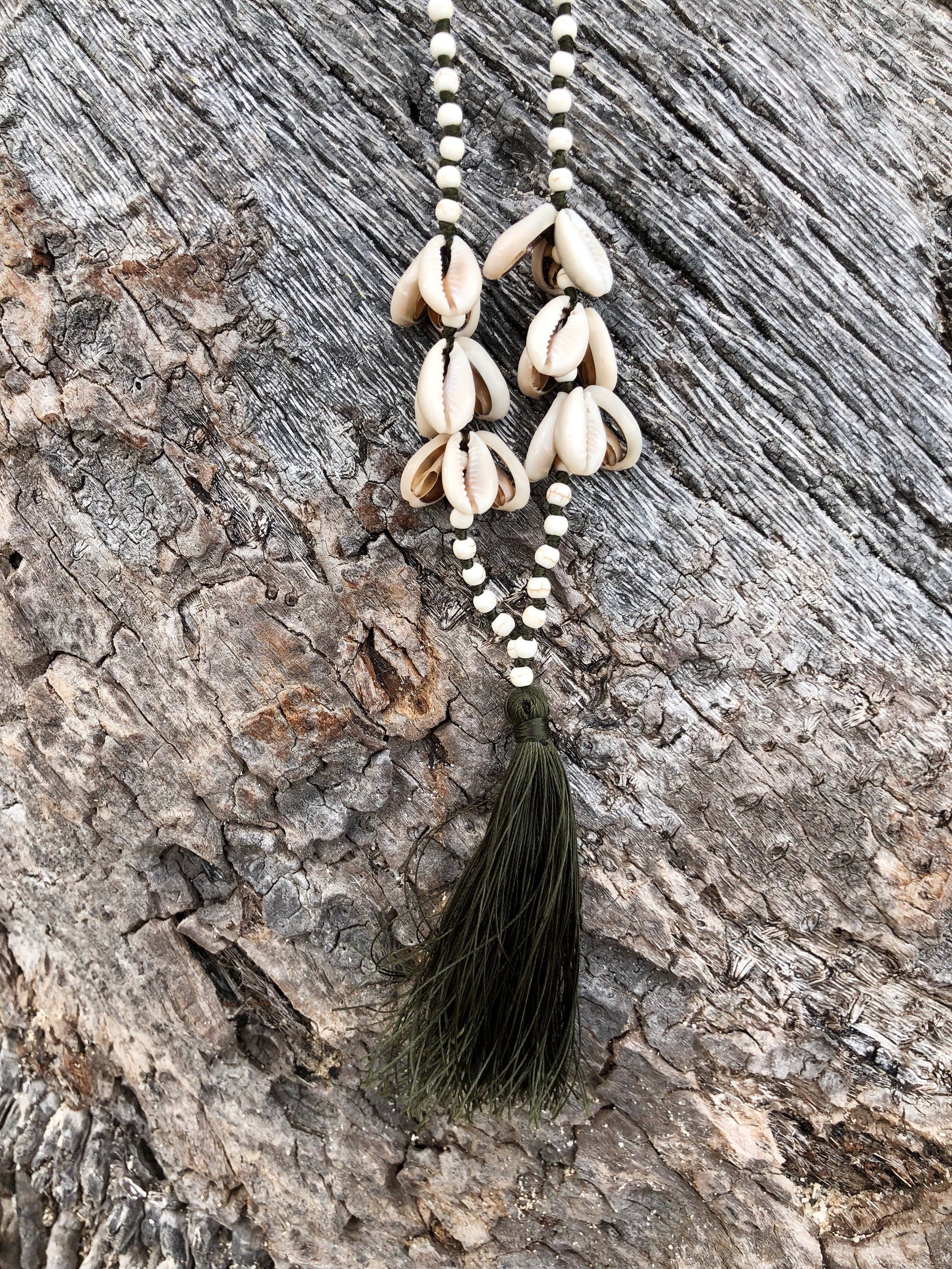Collier long avec coquillages porte-bonheur en pampilles montés sur des perles de bois